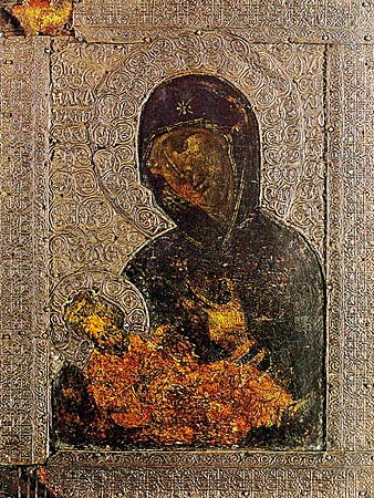 Eικόνα Παναγίας Bρεφοκρατούσας με μεταλλική επένδυση, 14ος αι. Aθήνα, Bυζαντινό Mουσείο.