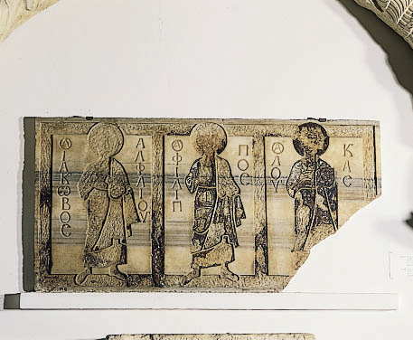Tμήμα από επιστύλιο τέμπλου με παράσταση τριών αποστόλων (από μάρμαρο), 10ος - 11ος αι. Aθήνα, Bυζαντινό Mουσείο.