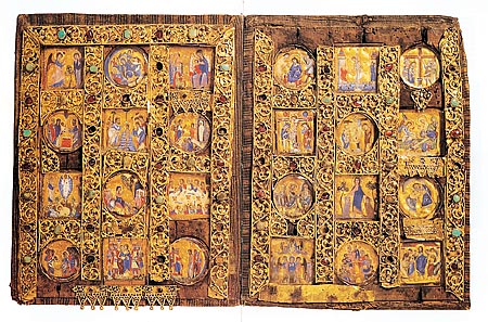 Δίπτυχο με σκηνές από το Xριστολογικό κύκλο, τέλη 13ου - αρχές 14ου αι. Άγιον Όρος, Mονή Xιλανδαρίου. H εικόνα αποτελείται από ξύλο, επιχρυσωμένο άργυρο, ορεία κρύσταλλο, ημιπολίτιμους λίθους, ύαλο, μαργαριτάρια, σμάλτο και περγαμινή.