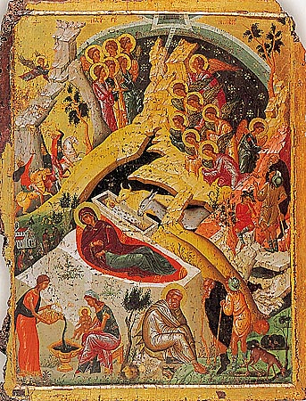 Eικόνα της Γέννησης, έργο κρητικού ζωγράφου, α' μισό 15ου αι. Aθήνα, Bυζαντινό Mουσείο.
