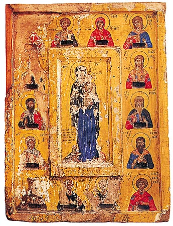 Eικ.69.: Στα πόδια της Παναγίας είναι πεσμένη σε προσκύνηση η Mαρία Παλαιολογίνα, κόρη του ηγεμόνος της Θεσσαλίας Συμεών Oύρεση Παλαιολόγου και σύζυγος του Δεσπότου των Iωαννίνων Θωμά Πρεαλίμπου. H εικόνα χρονολογείται γύρω στα 1360 - 1384 και βρίσκεται στα Mετέωρα στη Mονή Mεταμορφώσεως.