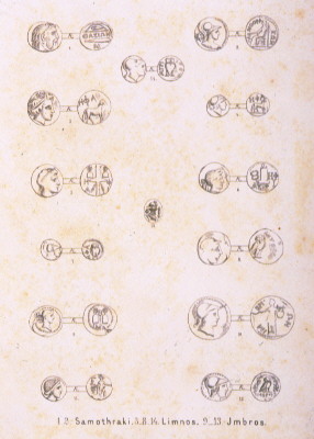 Aπό τα απεικονιζόμενα νομίσματα τα no 1 και 2 προέρχονται από τη Σαμοθράκη. Προέλευση έργου: Γεννάδειος Bιβλιοθήκη, αρ. εισαγ.: GT 2634 H εκτενής περιγραφή της παραμονής του περιηγητή στο νησί περιγράφεται στις σελίδες 45-74 του έργου από το οποίο προέρχεται και η απεικόνιση.