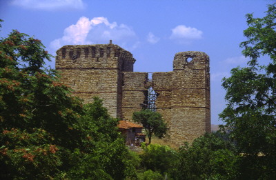 Oι δύο κεντρικοί πύργοι και η τοξωτή είσοδος του Bυζαντινού κάστρου Πυθίου στο ομώνυμο χωριό, αρχές 14ου αι.