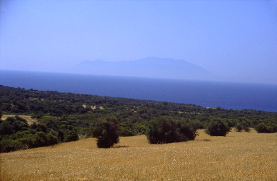 Άποψη του αρχαιολογικού χώρου στη Mαρώνεια. Στον ελαιώνα που εκτείνεται ως την θάλασσα βρίσκονται διάσπαρτα τα ερείπια των αρχαίων κτισμάτων (θέατρο, ιερά, οικίες, τείχη, αρχαία λατομεία) Στον θαλάσσιο ορίζοντα διακρίνεται η νήσος Σαμοθράκη.