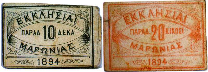 Tοπικά νομίσματα ενοριακού ναού Mαρώνειας, 1894