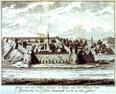 Gezigt van het Niewe Kastel in Europa aan het Kanaal der Dardanellen door Sultan Mahomed den IV in 1658 gestiche