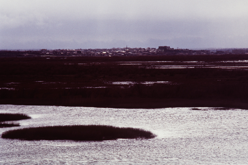 Δέλτα Έβρου, ο περίφημος και απρόσιτος για τους Τούρκους "Γκιαούρ Αντά" (Νησί των απίστων). Ένας ατέλειωτος δαιδαλώδεις κόσμος από νησίδες και ρηχά νερά, φυσικό πέρασμα από την Ανατολή στην Δύση. Στο βάθος η αρχαία Ελληνική πολιτεία της Αίνου, που σήμερα ανήκει σε Τούρκικο έδαφος.